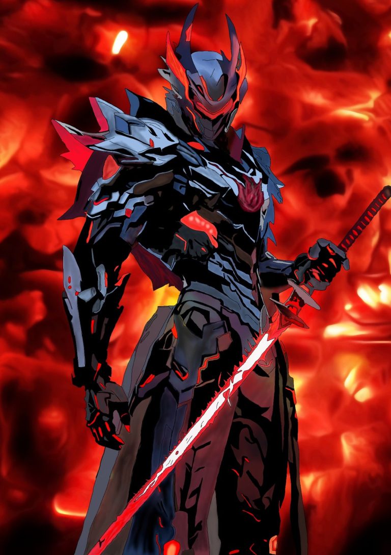 Seine bedrohliche Aura wird durch die glühend roten Akzente verstärkt – besonders durch das flammende Schwert, das Energie und Kraft ausstrahlt. Der Hintergrund, ein Meer aus loderndem Rot und Feuer, betont die dramatische Präsenz der Figur und macht IGRES zu einem Sinnbild für Stärke, Entschlossenheit und unaufhaltsame Macht.